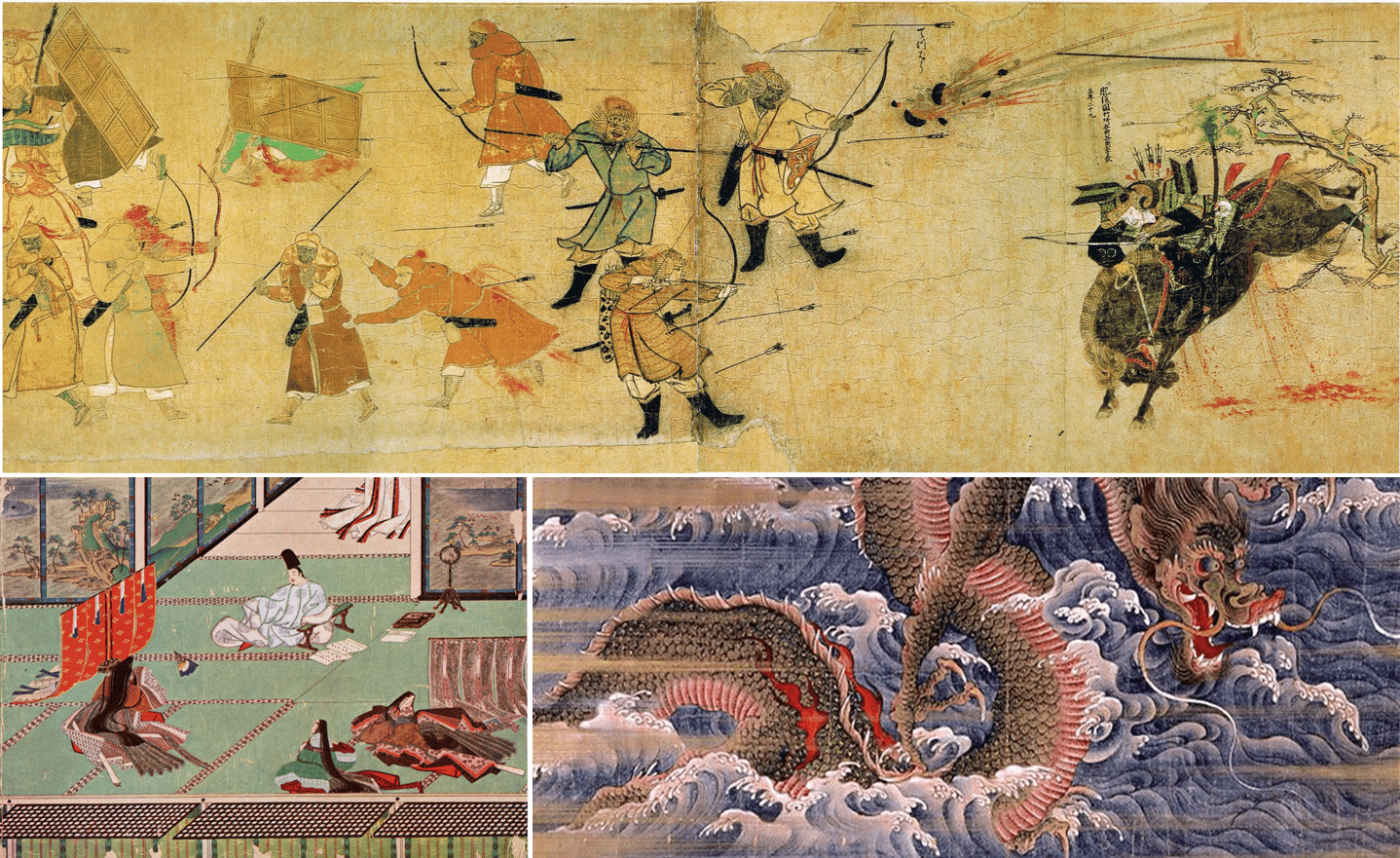 Imágenes de distintos emaki: Môko Shûrai Ekotoba (arriba), Kasuga Gongen Genki-e (abajo izquierda) y Oguri Hangan Emaki (abajo derecha).