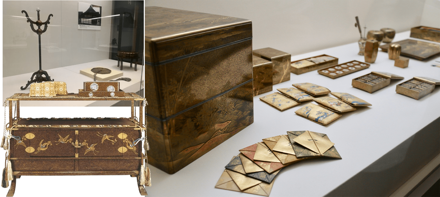 Algunos de los objetos pertenecientes al Higyô-sha: el set de espejo (izquierda arriba), el mueble decorado en nashiji con las almohadas y unas cajas (izquierda abajo) y el set completo de una de las cajas de incienso (derecha) [esta última foto no pertenece a la presente exposición].