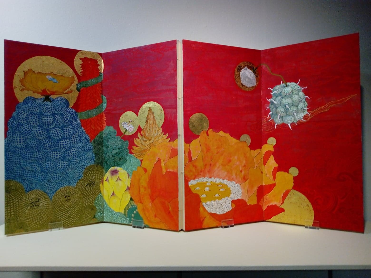 Como se aprecia en las fotografías, en la exposición se muestran obras de la artista realizadas en diferentes formatos, como cuadros, biombos, cerámicas, instalaciones…