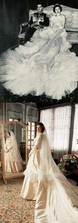 Arriba, una de las muchas fotos sobre la boda real que publicó la revista Life. Debajo, fotograma de la serie en el que apreciamos la cuidada recreación.