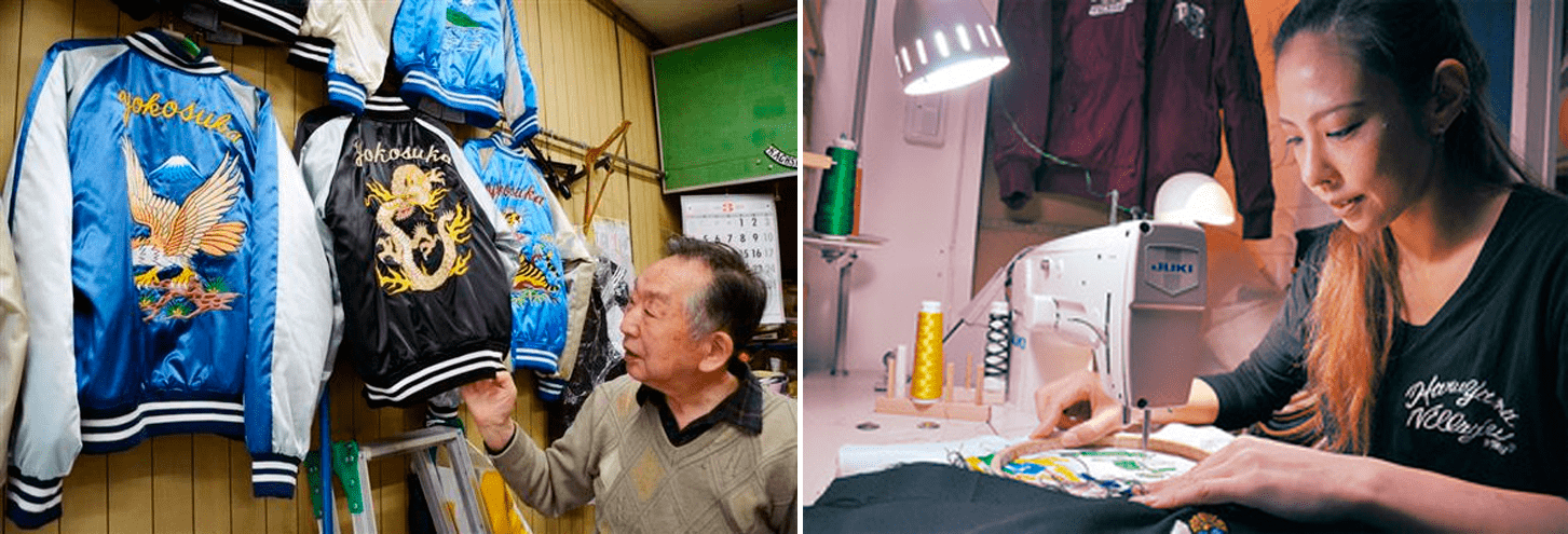Sukajan es una abreviatura de “Yokosuka-shi janpaa”, o “jersey de la ciudad de Yokosuka”, aunque fuera de Japón son más conocidas como “souvenir jackets”. Antes de seguir, queremos aclarar que no tienen que confundirse con las sutajan, abreviatura de “sutajiamu janpaa” o “jerséis de estadio” que se refieren a aquellas chaquetas con nombres y números de equipos deportivos, cuyo diseño y producción son completamente diferentes. Volviendo a las sukajan, su origen se remonta a la posguerra de la Segunda Guerra Mundial (1939-1945), cuando los soldados americanos estacionados en Japón buscaban souvenirs, siendo especialmente populares productos tradicionales fáciles de transportar como los kimono y los obi. Viendo el interés que despertaban, hubo artesanos de la ciudad de Yokosuka (pref. Kanagawa) que empezaron a utilizar los paracaídas de hilo que llevaban los soldados para fabricar las chaquetas de béisbol a las que estaban acostumbrados los extranjeros, pero bordando en ellas los motivos típicos japoneses preferidos por los forasteros, una combinación que disfrutó de un enorme éxito. Se considera que la primera empresa que empezó a fabricarlas en serie fue Kôshô Shôkai, la antecesora de lo que es ahora Tôyô Enterprise, quien contrató los servicios de especialistas en bordado de las ciudades de Kiryû (pref. Gunma) y Ashikaga (pref. Tochigi). Estas chaquetas empezaron a venderse en las Post Exchange, tiendas en las bases militares estadounidenses, propiciando que se extendieran por todo Japón e incluso llegaran hasta las bases de Estados Unidos, siendo su época dorada los años cincuenta. Poco después empezaron a venderse en los alrededores de Yokosuka a la población civil japonesa, concretamente en el distrito comercial conocido como Tobuita-dôri, recibiendo el nombre de “sukajan” en los años setenta, cuando se convirtieron en parte de la moda urbana y se popularizaron entre los jóvenes japoneses que idolatraban la cultura americana, pasando ya a convertirse en una prenda unisex. Tuvieron otro boom en los años noventa, aunque posteriormente, con el cambio de la cotización entre el dólar y el yen, se volvieron más difíciles de conseguir en el extranjero. En la actualidad, al igual que muchos otros productos que tienen su origen en el otro lado del mar (desde la fûrin a la tempura), ya se considera un producto típicamente japonés.