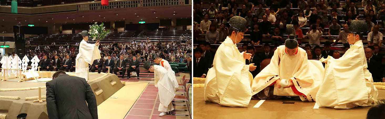 Como ya se ha comentado anteriormente, el ôzumô sigue considerándose un ritual sintoísta, y como tal, durante los combates se realizan un gran número de ceremonias relacionadas con esta religión animista autóctona de Japón.