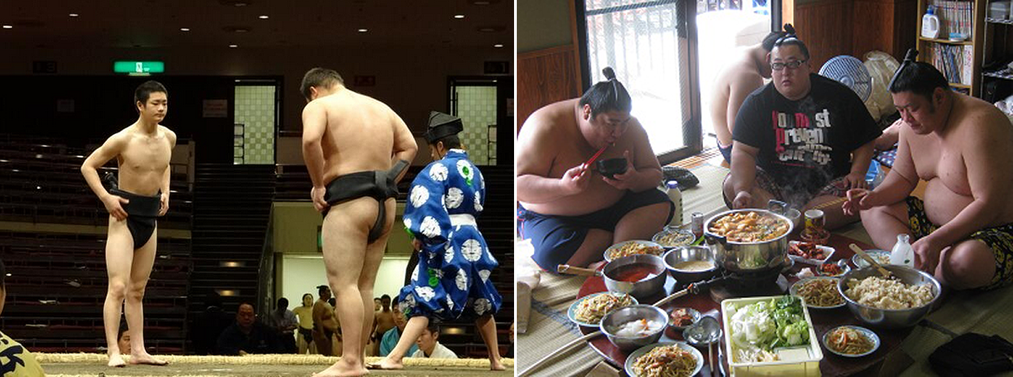 Combate de maezumô (izquierda) y rikishi comiendo chanko nabe en la heya Kasugayama (derecha).
