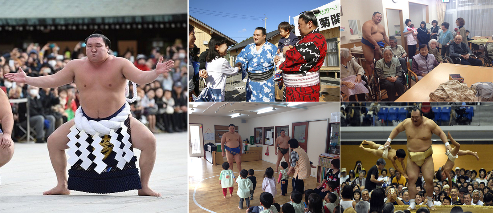 Yokozuna durante su ceremonia de ascenso (izquierda) y rikishi durante sus labores sociales: visitando víctimas de desastres naturales (arriba centro), en residencias de ancianos (arriba derecha) y guarderías (abajo centro), y participando en el chibikko sumô (abajo derecha).