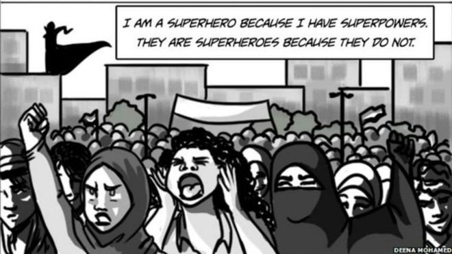 Quizás todo pueda reducirse a la poderosa idea de revolución y solidaridad que subyace en una de las viñetas de la superheroína egipcia Qaheera, feminista y velada, quien, al contemplar a un grupo de mujeres en primera línea de una numerosa y agitada manifestación, expresa la siguiente idea: “Soy un superhéroe porque tengo superpoderes. Ellas son superhéroes porque no los tienen”.[19]