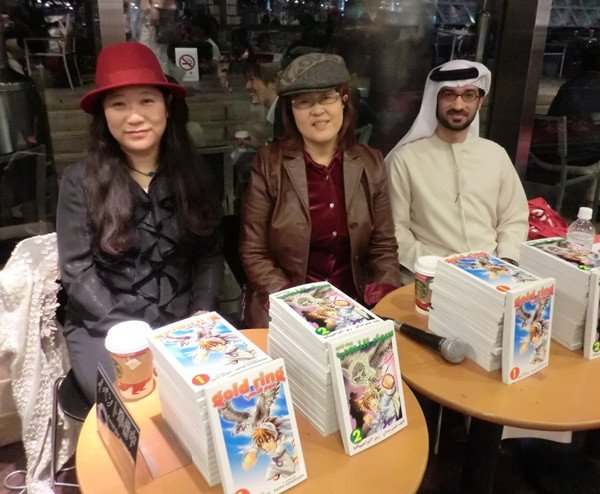 [13] Gold Ring (سوار الذهب, Siwari Al-Dhahab) es un manga emiratí escrito en árabe clásico y disponible en inglés bajo distribución postal, concebido por Qais Sedki, y aparecido en el mercado en 2010, año en que fue merecedor del premio Zayed de literatura infantil. Para dibujarlo contactó al dúo japonés Akira Himekawa (formado por las mangakas A. Honda y S. Nagano, que habían trabajado con clásicos como Astro Boy y The Legend of Zelda), mientras que él se ocupó de la historia, guión y distribución, para lo que dejó su trabajo como informático y fundó la editorial Pageflip en Dubai; Sedki viajó a Japón y el trío trabajó conjuntamente con la ayuda de un traductor. Mientras que algunos indican que la elección del árabe clásico se debe a generar una universalidad comercial para la obra, el propio Sedki indica que lo eligió por la necesidad de perpetuar el idioma entre los jóvenes y desvincularlo de los “aburridos” ambientes tradicionales, como la escuela o la mezquita. Fascinado desde niño con la cultura japonesa, Sedki eligió el formato manga para acercar a los jóvenes algunos elementos de la cultura árabe tradicional. Un segundo volumen aparecería saldría al mercado en 2012 y en 2014 el estudio Gainax anunció que realizaría una versión animada, de la que se llegó a lanzar un traíler, pero de la que parece que no ha habido más noticias.