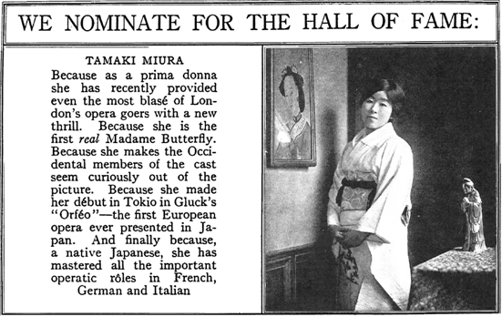 [2] Ciertas fuentes retrotraen hasta 1909 ese debut. Sin embargo la propia soprano refirió a Frederick H. Martens en 1923 que el tenor Adolfo Sarcoli la preparó para su debut, no llegando el divo italiano al Japón hasta 1911, por lo que parece más fiable el dato que nosotros reflejamos (Martens, Federick H., The Art of the Prima Donna and Concert Singer, Nueva York, D. Appleton&Co., 1923, pp. 209-219).