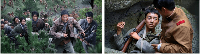 Izquierda: Escena de la batalla de Fengwudong. Derecha: Escena en la que el joven militar japonés ayuda a escapar a un independentista del ejército de élite.