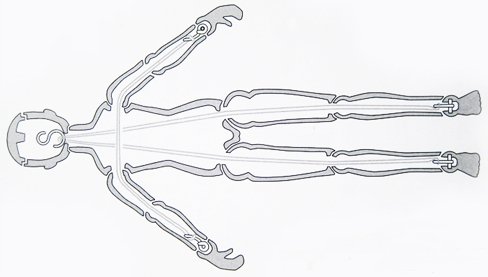 Esquema interior de una BJD. Mediante este dibujo podemos apreciar la estructura de cuerdas que recorre el cuerpo de la muñeca y le permite los diferentes movimientos.