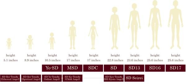 En este cuadro podemos apreciar los diferentes tamaños y moldes de BJD propuestos por la firma Volks.