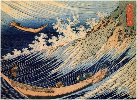 Katsushika Hokusai (31 de octubre de 1760 – 10 de mayo de 1849) nacido bajo el nombre de Kawamura Tokitarô en la antigua Edo (actual Tokio), en el barrio de Honjo, situado en Katsushika, distrito de la provincia de Shimofusa, fue uno de los grandes representantes de la pintura ukiyo-e. No se sabe prácticamente nada sobre sus orígenes familiares ya que a la edad de cuatro o cinco años fue adoptado por la familia de Nakajima Ise (cabiendo también la posibilidad de que fuera un hijo extramatrimonial de la misma), cuyo trabajo era la fabricación artesanal de espejos para la corte del shôgun. Se dice que a la temprana edad de seis años ya mostraba cierto interés por el dibujo y «la forma de las cosas». En su etapa adolescente cambió su nombre por Tetsuzô y llegó ya a trabajar en el taller de un librero para ganarse el jornal. Allí aprendió a dibujar de manera autodidacta observando con detalle estampas xilográficas encontradas en varios libros del taller. También fue aprendiz de un grabador de madera, asimilando así el oficio de horishi y familiarizándose de esta manera con la técnica xilográfica, ya que en 1775 se tiene constancia de que grabó las letras para doce páginas de un relato popular. Entorno a 1778 logra convencer a uno de los más celebres pintores de estampas ukiyo-e de entonces, Katsugawa Shunshô (1726-1792), famoso por sus pinturas teatrales y la viveza con que representaba a los protagonistas de las mismas, sus mujeres hermosas, sus retratos eróticos y sus luchadores de sumô, para que le acepte como alumno y así poder empezar a pulir su técnica y la representación de los diferentes elementos que la componen. En esta época también fue muy significativa la escuela Torii, la cual tenía importantes pintores como Torii Kiyonaga (1752-1815) con un estilo que aparentemente era más convencional, careciendo del dinamismo representativo de otras escuelas.