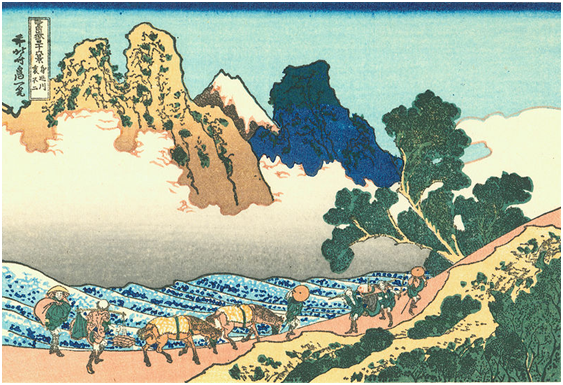 Parte posterior del Fuji desde el río Minobu, Treinta y seis vistas del monte Fuji, 1831-1833, grabado ukiyo-e.
