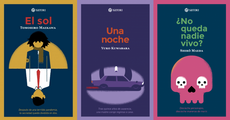 Portada de las obras El sol, de Tomohiro Maekawa, Una noche, de Yuko Kubawara, y ¿No queda nadie vivo? de Shirô Maeda. Más información de la colección de teatro de Satori disponible aquí.