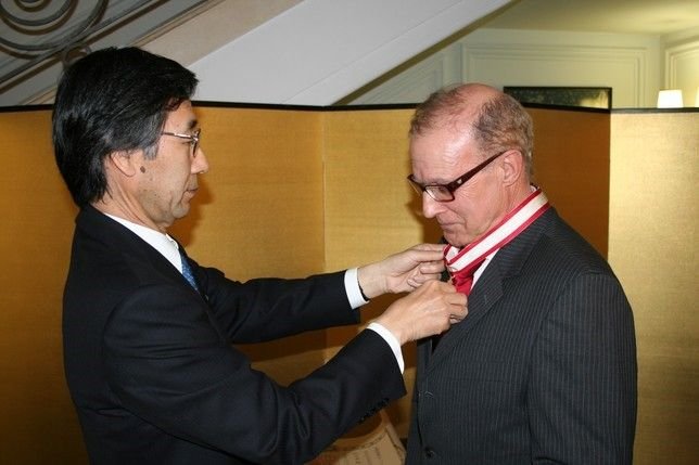 Fotografía del momento en el que el embajador de Japón en España, Satoru Satoh, condecora a Carlos Rubio con la Orden del Sol Naciente de Rayos Dorados y Cinta Colgante. Foto: Embajada de Japón.