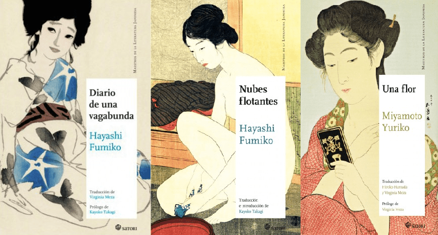 Portada de las obras Diario de una vagabunda y Nubes flotantes, de Fumiko Hayashi, y de Una flor de Yuriko Miyamoto, de Satori Ediciones. Forman parte de la colección “Maestros de la literatura japonesa”. Más información disponible aquí.