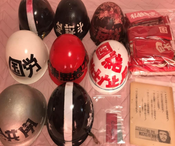 Material de batalla del Zengakuren, con cascos distintos para cada facción.