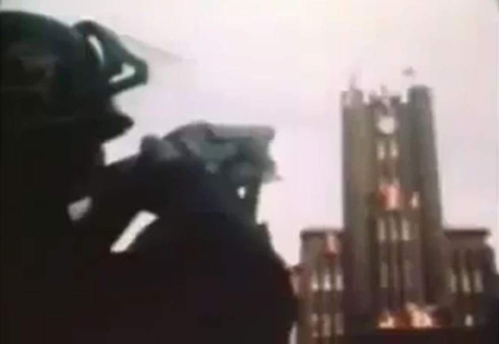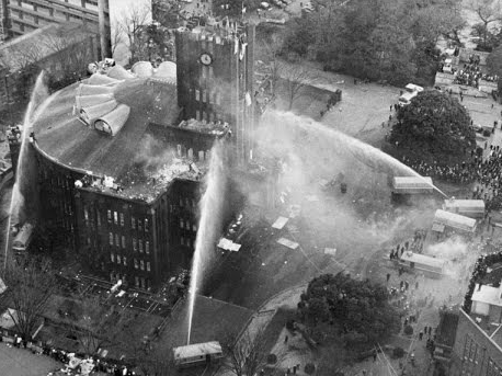 Asedio final de la torre del reloj del Hall Yasuda, en llamas, 1969.
